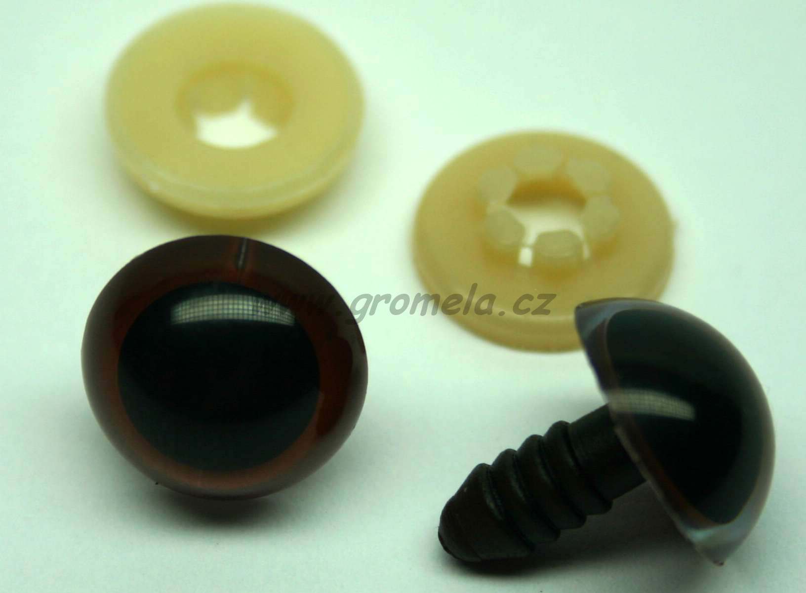 Bezpečnostní oči s pojistkou pro medvědy a jiná zvířátka. Hnědá barva, průměr 15 mm.